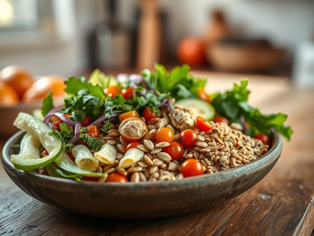 Meal Prep: Para recalentar o consumir al día siguiente, evita el microondas a máxima potencia. El calor intenso puede endurecer las proteínas. Es mejor consumir la ensalada a temperatura ambiente o templarla ligeramente en una sartén de fondo pesado con una cucharada de agua para regenerar la humedad.